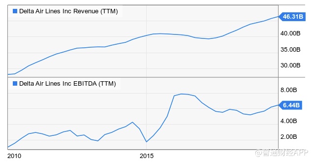 金融危机过后,随着经济持续扩张,达美航空在过去的10年里实现了强劲的增长。公司年收入复合增长率为5.17%,息税、折旧及摊销前利润(EBITDA)增长率为20.56%。