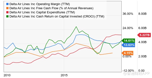 从过去十年的表现来看,达美航空的营业利润率在稳步地持续扩大,同时,至少10%的销售额转化成为自由现金流,投资资本回报率也在11%-12%之间。