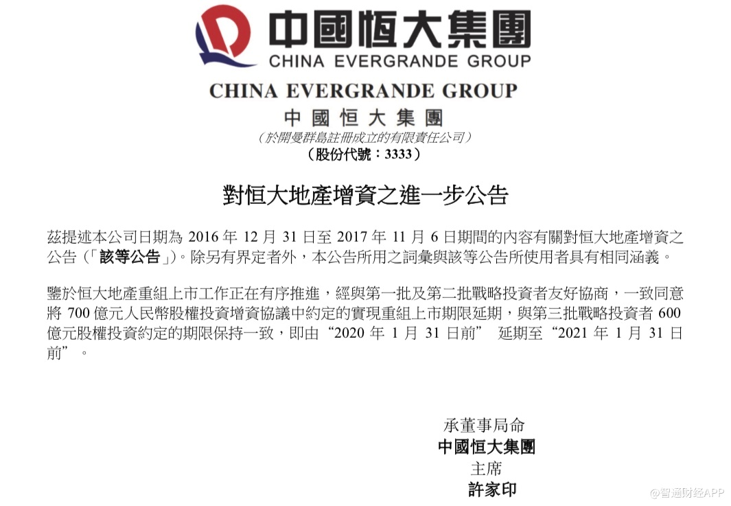 新年伊始,恒大迎来多重利好。智通财经APP获悉,1月13日,中国恒大(03333)发布公告显示,第一批及第二批战略投资者一致同意,将700亿人民币股权投资增资协议中约定的实现重组上市期限延期,与第三批战略投资者600亿股权投资约定的期限保持一致,即由“2020年1月31日前”延期至“2021年1月31日前”。业内人士认为,中信、山东高速、深业集团、中融等战略投资者同意延长重组上市期限一年,显示出对恒大重组成功的巨大信心。