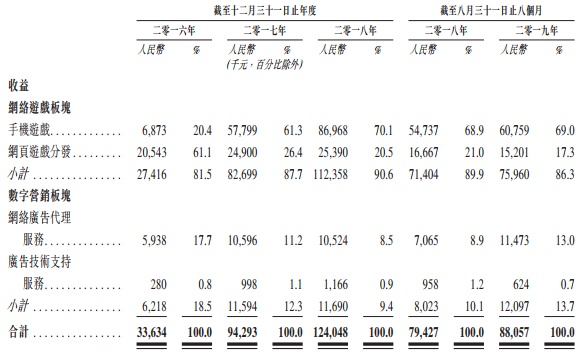 其中公司的主要收益来自网络游戏版块,2016年-2018年及截止2019年八个月,其收益分别占总收益的81.5%、87.7%、90.6%及86.3%。值得注意的是,于相同期间,来自手游的收益自2017年开始成为网络游戏版块的主力,分别占总收益的20.4%、61.3%、70.1%及69%。
