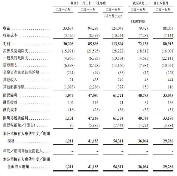 于往绩记录期,公司的收益显着增加,主要由于(i)公司手机游戏及网页游戏平台的累积注册玩家总数增加;(ii)公司的手机游戏玩法组合及公司的地理覆盖不断扩大及(iii)公司服务的广告客户数量增加。此外,公司于2017年推出的手机游戏「亲友圈」功能致使私人游戏房卡的消秏显着增长。2016年-2018年及截止2019年八个月,公司的总收益分别为人民币3363.4万元,人民币9429.3万元、人民币1.24亿元及人民币8805.7万元。