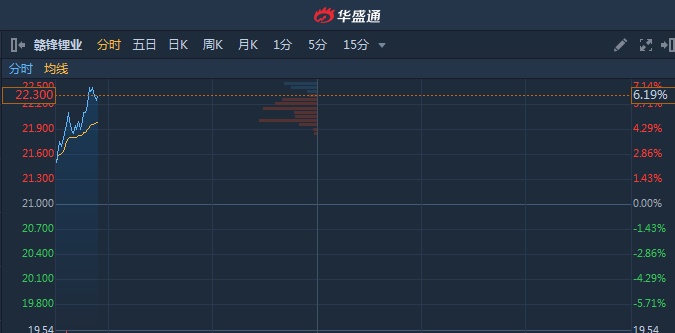 截至9时53分,赣锋锂业(01772)涨6.19%,报价22.3港元,成交额3137万。值得注意的是,该股盘中一度高见22.6港元,再次刷新历史新高。