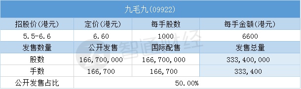 智通财经APP获悉,1月14日,九毛九(09922)配售结束。配售招股价5.5-6.6港元,最终定价6.6港元,每手6600港元。