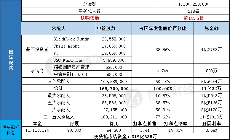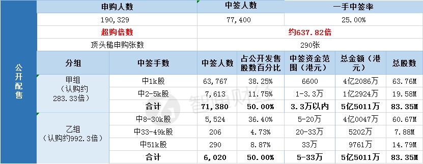 其中,公开配售申购人数190329,一手中签率25%,超购倍数约637.82倍。