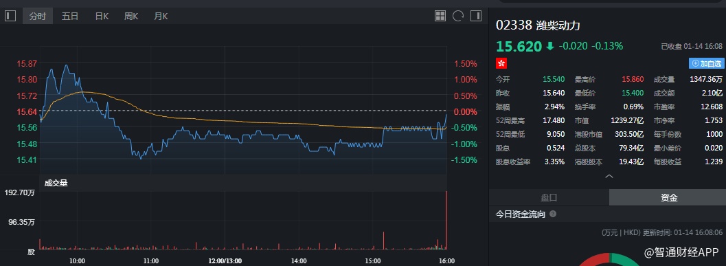 截至今日收盘,潍柴动力跌0.13%,报15.62港元。