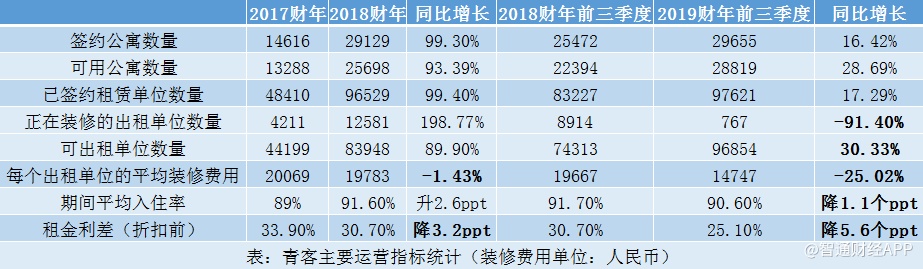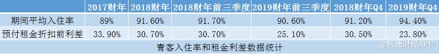 由于2018财年时正在装修的出租单位数量同比增长仅2倍,为快速消化房源,青客在2019财年前三季度对租金进行了一定下调,但平均入住率仍下降1.1个百分点。