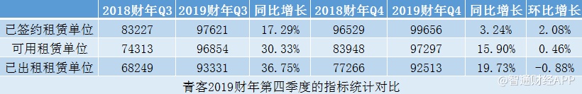 至2019财年第四季度时,青客扩张速度放缓的特征则更为明显,已签约租赁单位为99656,同比增长仅3.24%,环比增长仅2.08%。同时,可用租赁单位的环比增速仅0.46%,即第四季度时新增的可用租赁单位仅443个。