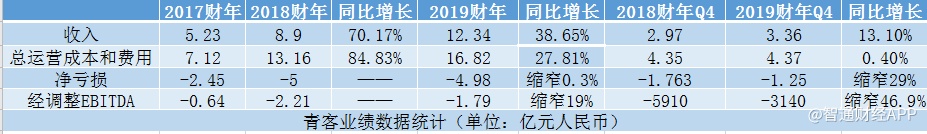 不过,在股价疲软之际,青客发布了上市后的第一份业绩。据数据显示,青客在2019财年第四季度(截至9月30日止)的收入为3.36亿元,同比增长13.1%;且净亏损缩窄29%至1.25亿元,经调整后的EBITDA为-3140万元,同比缩窄46.9%。