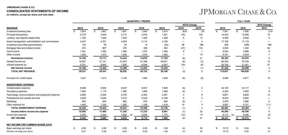 智通财经APP获悉,美东时间1月14日美股盘前,摩根大通(JPM.US)公布了2019年第四季度及全年财报,报告显示,摩根大通Q4净利润为85.2亿美元,同比增长21%。全年净利润为364.3亿美元,同比增长12%。