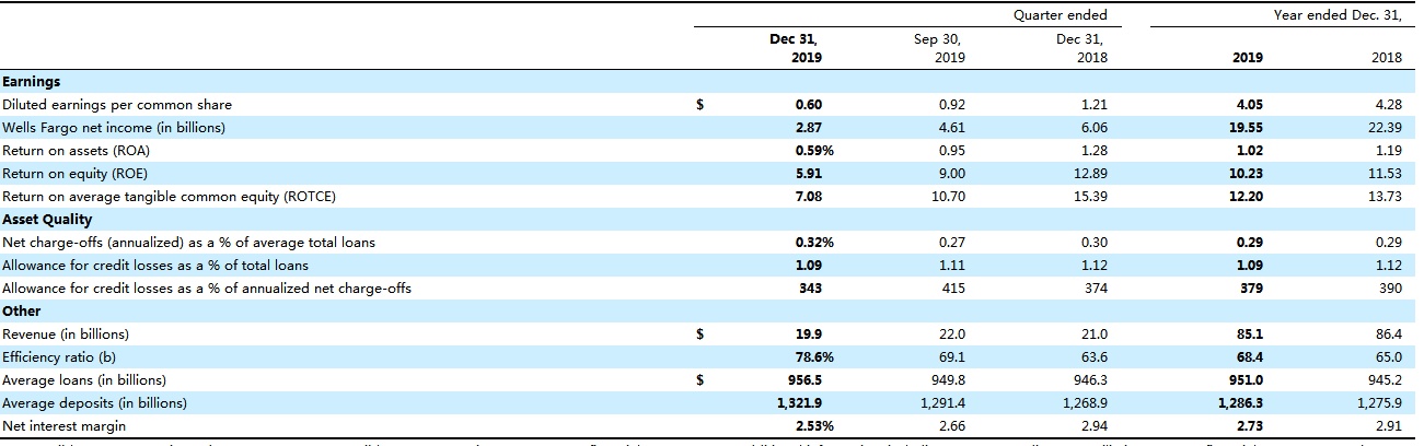 智通财经APP获悉,1月14日富国银行(WFC.US)发布了2019年4季度和全年的财务报告。截止2019年12月31日,富国银行四季度营业收入199亿美元,同比减少8%,低于市场预期。四季净利润29亿美元,较三季度下降57%,同比下降86%。四季摊薄每股收益为0.60美元。营收下降原因主要是净利息收入减少,权益证券净收益下降等。