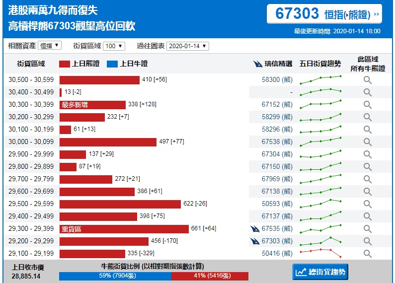 智通财经APP获悉,截至1月14日,恒指最新的牛熊街货比例59:41。瑞信恒指牛熊证街货分布图中的数据显示,熊证街货重货区在29300-29399区间,该区间最新熊证数量为661张,较上一交易日增加64张,最多新增在30300-30399区间,该区间最新熊证数量为338张,较上一交易日增加128张。牛证街货重货区在28400-28499区间,该区间最新牛证数量为677张,较上一交易日增加361张,最多新增也在同一区间。