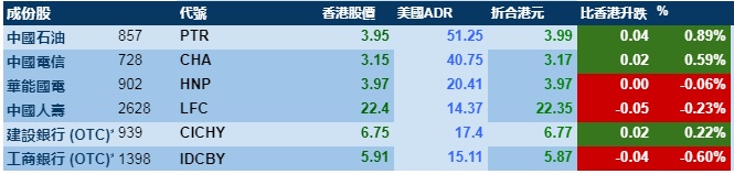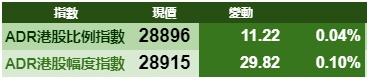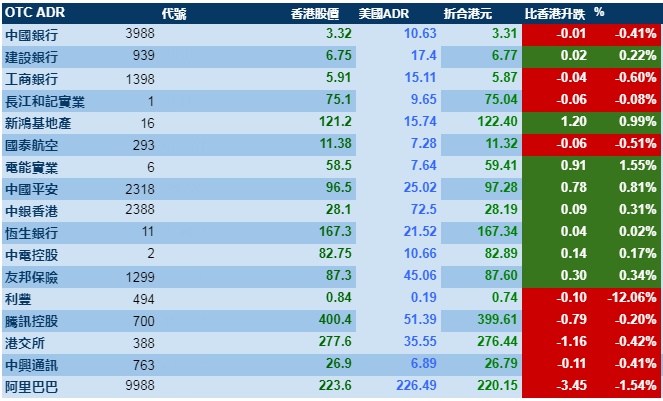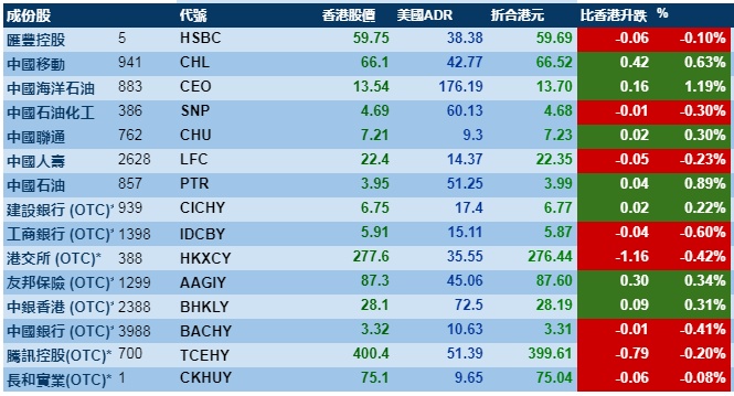 智通财经APP获悉,隔夜美股三大股指涨跌不一,港股ADR指数轻微上涨,按比例计算,收报28896点,升11.22点或0.04%。大型蓝筹走势偏弱,汇丰控股收报59.69元,较港收市跌0.06元;腾讯控股收报399.61元,较港收市跌0.79元。