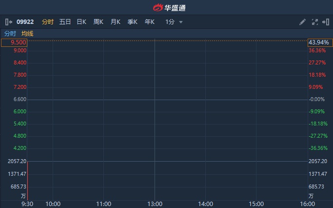 智通财经APP获悉,九毛九(09922)首日挂牌,公告显示,公司发行3.334亿股,每股定价6.6港元,每手1000股,所得款项净额约20.756亿港元。截至发稿,涨43.94%,报9.5港元,成交额7.39亿港元。