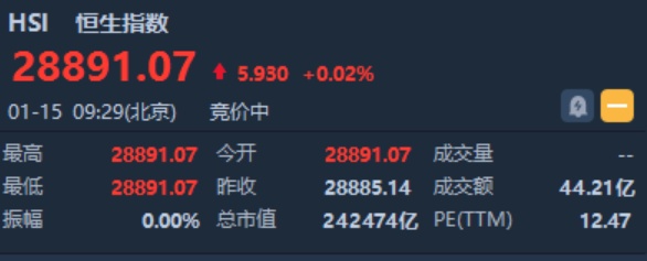 智通财经APP获悉,恒生指数开盘微升0.02%,报28891.07点。国企指数涨0.06%,报11362.32点。红筹指数涨0.26%,报4569.45点。大市盘前成交44.21亿港元。隔夜美股三大指数涨跌不一。