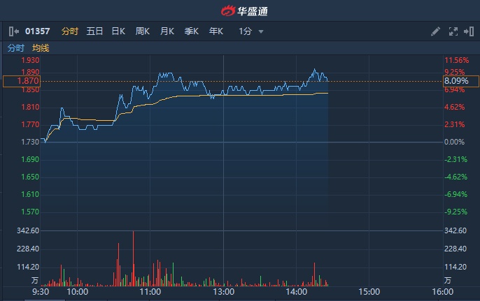 智通财经APP获悉,近期美图公司(01357)表示未来三年将进军医美行业,利好消息持续发酵,该股今日续涨近10%,近三日累涨超两成。截至发稿,涨8.67%,报1.88港元,成交额1.09亿港元。