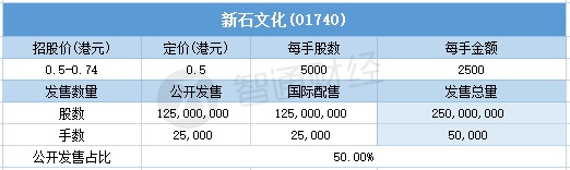 智通财经APP获悉,1月15日,新石文化(01740)配售结束。配售招股价0.5-0.74港元,最终定价0.5港元,每手2500港元。