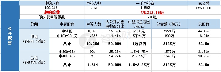 其中,公开配售申购人数100216,一手中签率1.5%,超购倍数约1212.16倍。
