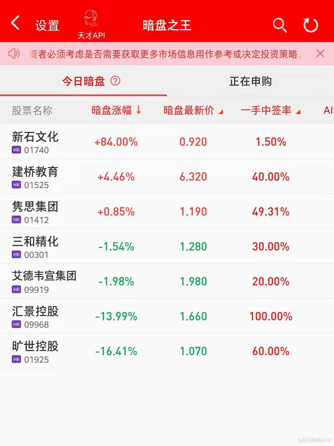 智通财经APP获悉,新石文化(01740)、建桥教育(01525)、隽思集团(01412)、艾德韦宣(09919)、三和精化(00301)、汇景控股(09968)、旷世控股(01925)将于1月16日挂牌,截止到发稿,利弗莫尔证券暗盘交易分别显示其涨84%、涨4.46%、涨0.85%、跌1.54%、跌1.98%、跌13.99%、跌16.41%。其中新石文化一度上涨150%。