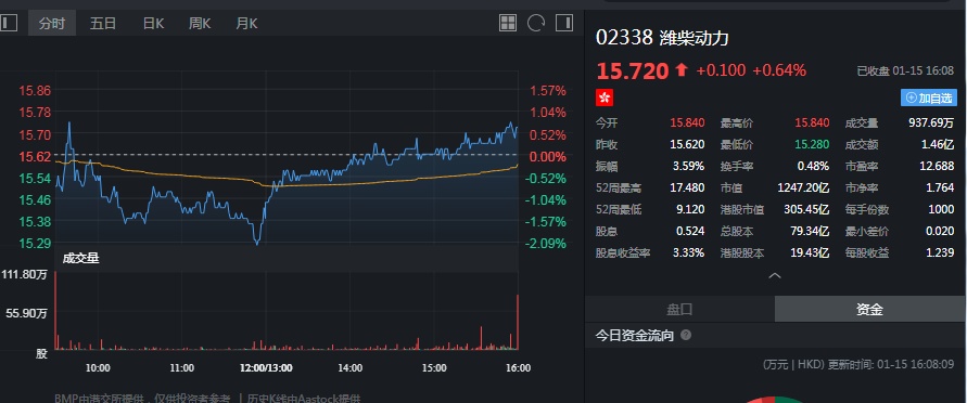 截至今日收盘,潍柴动力涨0.64%,报15.72港元。