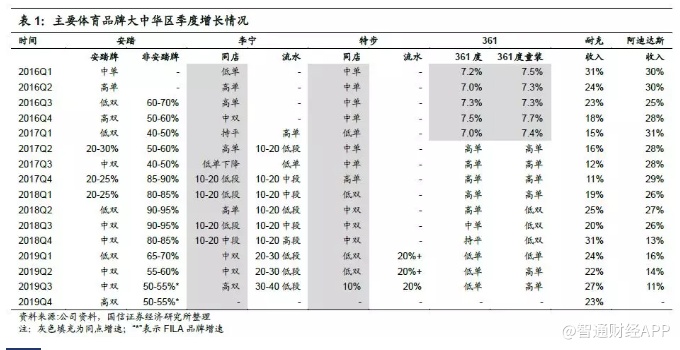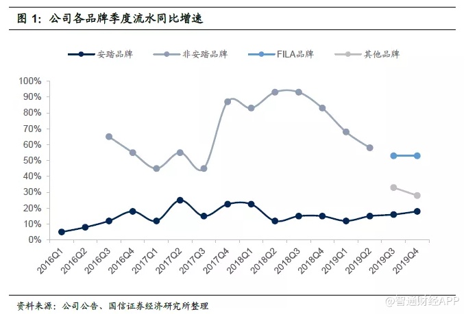 安踏牌/FILA/其他品牌分别录得中双位数/55%-60%/30%-35%的同比增长,预计2020年FILA保持30%以上的流水增长。