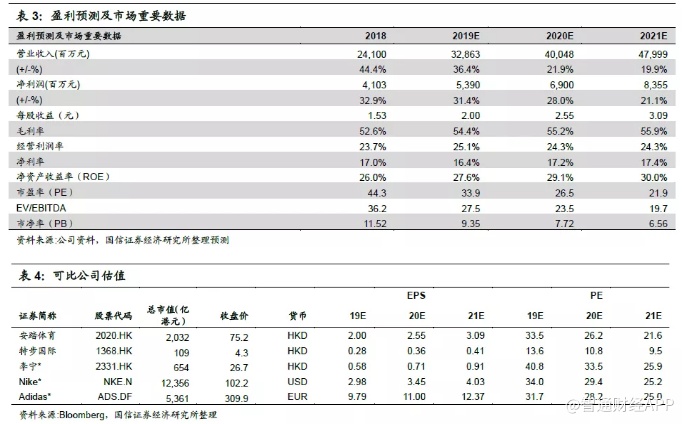 经营情况持续强劲,维持“买入”评级。短期看,公司季度销售强劲表现再次凸显了经营实力。长期看,公司作为国产体育用品龙头,盈利能力强,品牌矩阵丰富,成长空间广阔。鉴于可转债的利息摊销暂无法确定,我们维持盈利预测,预计公司19-21年净利润增速分别为31.4%/28.0%/21.1%,EPS分别为2.00/2.55/3.09元,PE分别为33.9x/26.5x/21.9x,考虑公司增长持续强劲,未来经营确定性增强,我们上调公司合理估值至91-93港元,对应2021年26.5-27.0x PE,维持“买入”评级。