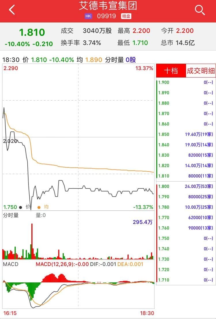 智通财经APP获悉,艾德韦宣(09919) 将于1月16日在香港挂牌,利弗莫尔证券暗盘显示,截至收盘,其股价较招股价2.02港元跌10.40%,报1.81港元,每手2000股,不计手续费,每手亏420港元。