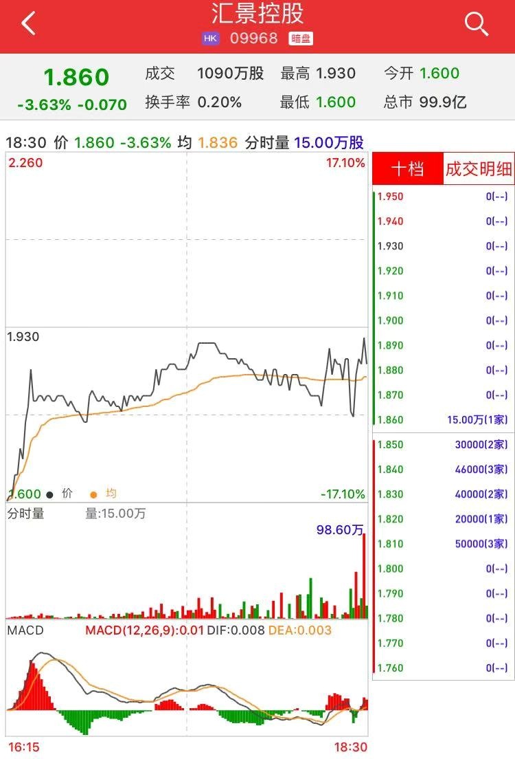 智通财经APP获悉,汇景控股(09968)将于1月16日在香港挂牌,利弗莫尔证券暗盘显示,截至收盘,其股价较招股价1.93港元跌3.63%,报1.86港元,每手2000股,不计手续费,每手亏140港元。