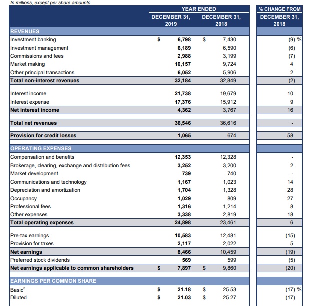 在2019年,高盛因诉讼和监管程序的记录亏损为12.4亿美元,这使摊薄后的每股收益减少了3.16美元。同时将ROE减少1.5个百分点,ROTE减少1.6个百分点。