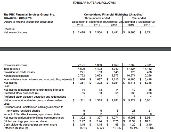 2019年全年,PNC通过回购2590万股普通股(价值35亿美元)和股息(价值19亿美元)向股东返还了54亿美元的资本。PNC普通股一级资本比率是9.6%。