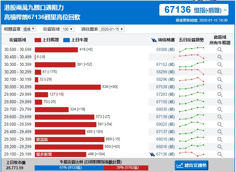 智通财经APP获悉,截至1月15日,恒指最新的牛熊街货比例61:39。瑞信恒指牛熊证街货分布图中的数据显示,熊证街货重货区在29300-29399区间,该区间最新熊证数量为669张,较上一交易日减少15张,最多新增在29100-29199区间,该区间最新熊证数量为496张,较上一交易日增加104张。牛证街货重货区在28400-28499区间,该区间最新牛证数量为765张,较上一交易日减少17张,最多新增在28300-28399区间,该区间最新熊证数量为607张,较上一交易日增加191张。
