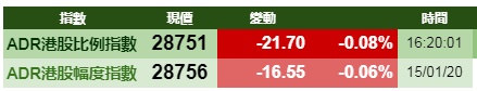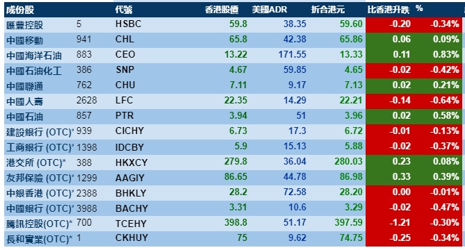 智通财经APP获悉,隔夜美股道指再创新高,港股ADR指数轻微收跌,按比例计算,收报28751点,跌21.7点或0.08%。大型蓝筹涨跌不一,汇丰控股收报59.60元,较港收市跌0.2元;腾讯控股收报397.59元,较港收市跌1.21元。