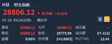 智通财经APP获悉,恒生指数开盘涨32.53点或0.11%,报28806.12点。国企指数涨0.18%,报11315.28点。红筹指数涨0.22%,报4555.07点。大市盘前成交37.41亿港元。