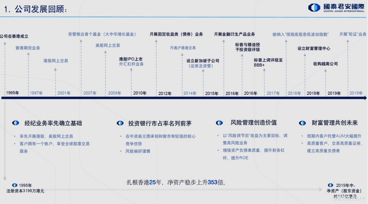 国泰君安国际1995年来到香港,当时母公司的注册资本只有3198万港元,而去年年中的归属母公司净资产是113亿港元,期间上升353倍,从股东的角度是较为可观的。如果大家有研究会看到,国泰君安国际的净资产提升是主要还是靠自己的未分配的盈利一步步提升的。因为对股权融资我们很谨慎,了解股东资金不是没有成本的,而且往往比债券融资更高,融资后需要投入好的项目,未来可以有更好的业绩。在多年“利滚利”的过程中,我们现在回看,公司抓住了这样一些机会:
