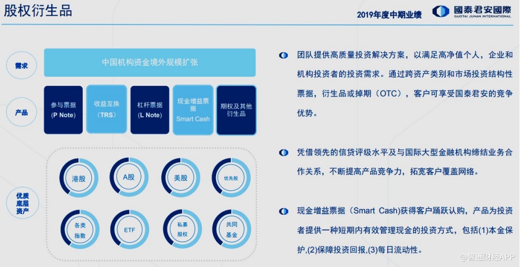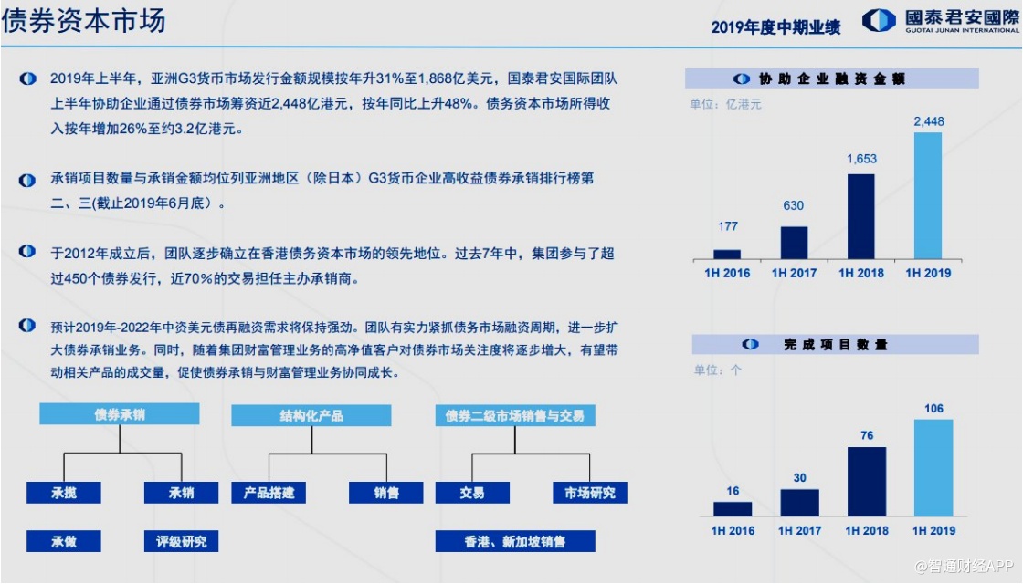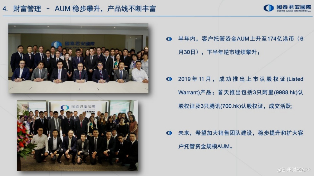 2018年11月,公司新的财富管理中心正式开业。在短短7个月内,公司的客户托管的资金(AUM)已上升到174亿港元。下半年香港发生了不确定性事件,影响到商业氛围,但公司财富管理AUM逐步上升的。国泰君安整体虽然规模不大,但是团队服务、平台优势、品牌和决策效率等综合优势吸引了很多高净值客户,也完全有能力和外资投行竞争。 同年11月,财富管理中心推出了轮证产品(类似国内权证),在香港发行了阿里和腾讯的Warrant产品,在市场上(两只)阿里(窝轮的)成效量排第一和第三,客户对国泰君安国际的产品的认购非常热烈。