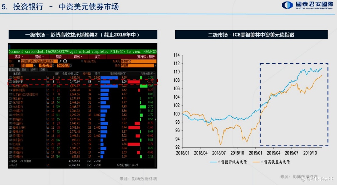 2. 中资美元债市场表现稳定,公司一二级市场联动效应明显。债券一级市场承销方面(下左图),大家都知道,包括去年内,这几年是企业发债和再融资的大年。上半年,我们在一级市场上的相对表现还不错,在彭博的中资美元债高收益类别上排第二,这个成绩是也是在谨慎的风险偏好情况下取得。到11月底,中资美元债二级市场指数(下图右,蓝色的是投资级的美元债,橙色的是高收益美元债)整体还是比较平稳的,相信对我们的债券做市业务会有正面影响,公司在承销债券之后也会为企业客户刚发行的债券提供流动性的管理。2019年,美联储已经两次减息,明年市场预计利率可能维持或还有下降空间,因此从现在来看,债券的二级市场预计仍然比较稳定。