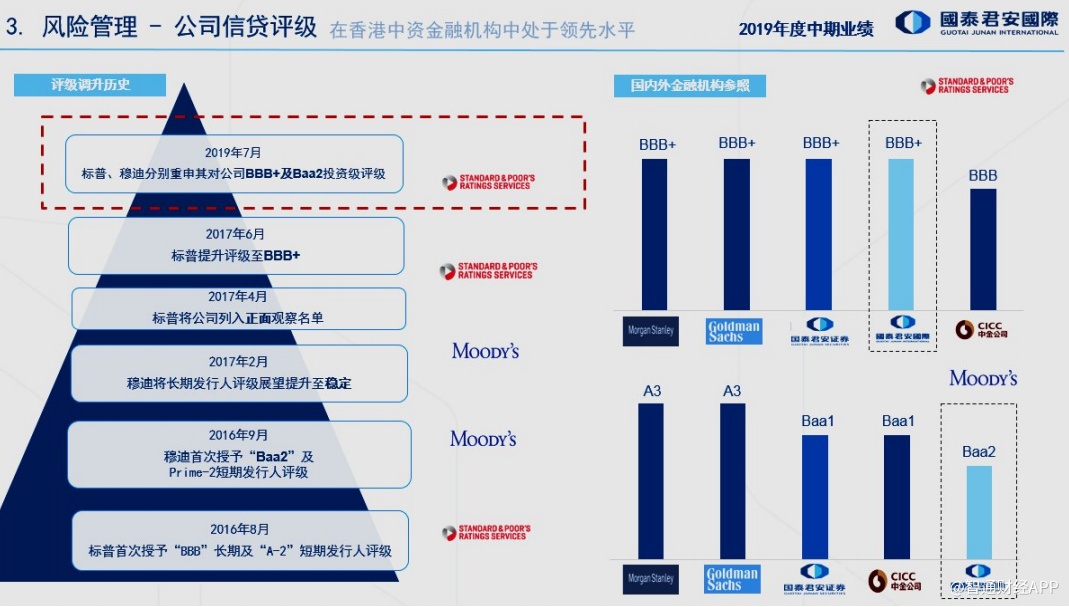 3. 穆迪、标普“重申”公司投资级信用评级,“展望”稳定:去年我们提过,因为国泰君安国际整体的风险管理严谨,而国际评级机构一直给予我们比较高的评级,标普的长期发行人是BBB+,穆迪则是Baa2。今年7月,标普和穆迪分别“重申”了对国泰君安国际的“投资级”信用评级(下图)。报告对公司作了较高评价,首先穆迪认可我们金融产品的商业模式,标普则对公司财富管理业务前景充满期待。如果有兴趣,也可以向穆迪和标普索取有关报告。