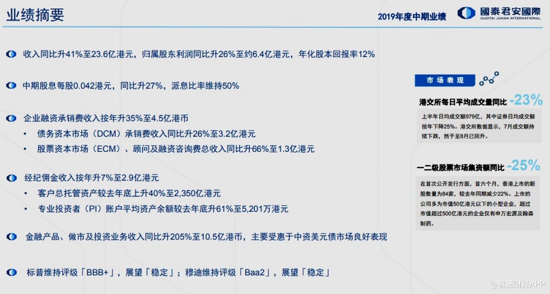 4.5亿港元。细分看,2019年上半年股票和债券一级承销表现都不错,债券刚刚提到了一级市场的表现,收入上升26%至3.2亿港元。而股票资本市场业务收入同比升66%至1.3亿。经纪收入是券商传统“看家”的业务,上半年整体港股成交量下降