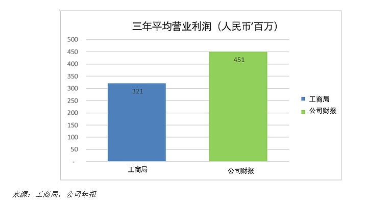 对比两组数据,差额令人瞠目结舌。其公司财报称,三年来平均实现营业利润人民币4.51亿元,比它在工商局申报的3.21亿元人民币足足高出40%以上。