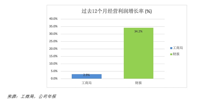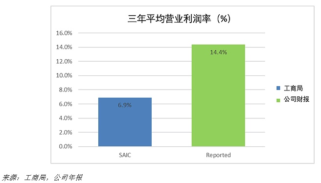 我们对比该公司在财报中向投资者披露的与在工商局所提交的利润数据。由于公司财年并不按公历年计算,为排除时间因素的干扰,我们使用了过去三年的历史数据。