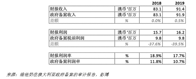 对此我们深表怀疑,在我们研究了该公司在澳大利亚唯一的子公司Vitasoy Australia Products Pte Ltd.的财务报告[1]后发现:公司在报道澳大利亚市场的利润方式上的套路和在中国的如出一辙。虽然在收入方面,财报与当地政府报告的数据一致,但在利润上,财报有严重虚报的嫌疑 ——因此利润率也被严重高估。我们可以说就算第一次的数据是不小心算错了,但第二次还能是巧合吗?亦或是管理层的有意为之?不管怎样,投资者都应心生警觉。