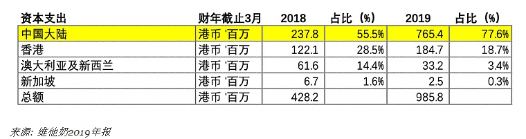 从2018财年到2019财年,资本支出从4.28亿港元飙升至9.86亿港元,增幅高达130%。从年报来看,这些费用大部分被投资到中国大陆。