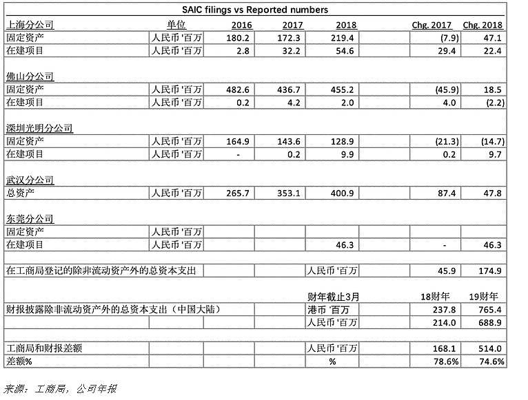 很显然,两组数据完全对不上。根据维他奶财报显示,公司于2017年新增资本支出人民币2.14亿元,2018年为6.89亿元。而工商局数据显示,公司在2017年和2018年的支出分别仅为人民币4590万元和1.75亿元。天差地别!我们在此能大胆推断:维他奶公司在持续做假账,不断误导审计公司、投资者和政府,来维持它编造的中国增长神话。