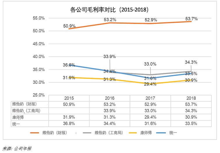如果看维他奶登记在工商局上的数据,一切就说得通了。维他奶在工商局申报的平均毛利率在33%左右,与其竞争对手的数字一致——见上图中灰线“维他奶(工商局)”。