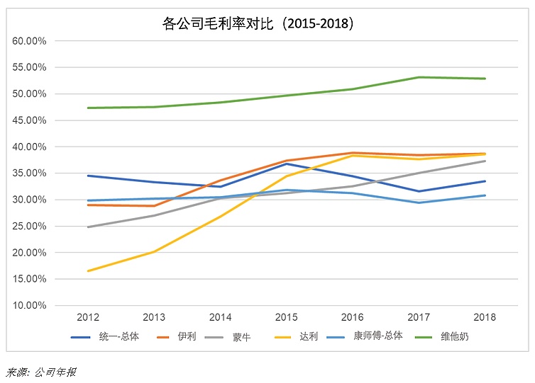 即使我们将维他奶的其他同品类公司拿出来作比对,例如达利食品(另一大豆饮料品牌豆本豆的母公司)和伊利、蒙牛等乳制品巨头,维他奶财报上的毛利率仍然远远高于他们。是不是特别神奇?