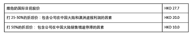 该机构称,“我们相信它的股价只值10港币/股,比目前价格还要下调65%,当然了,这已经是我们对维他奶国际一个比较保守的估计了。”