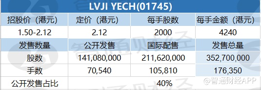智通财经APP获悉,1月16日,LVJI YECH(01745)配售结束。配售招股价1.50-2.12港元,最终定价2.12港元,每手4240港元。