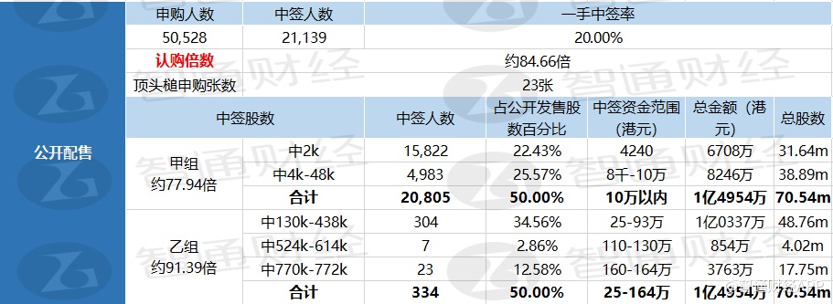 其中,公开配售申购人数50528,一手中签率20%,超购倍数约84.66倍。