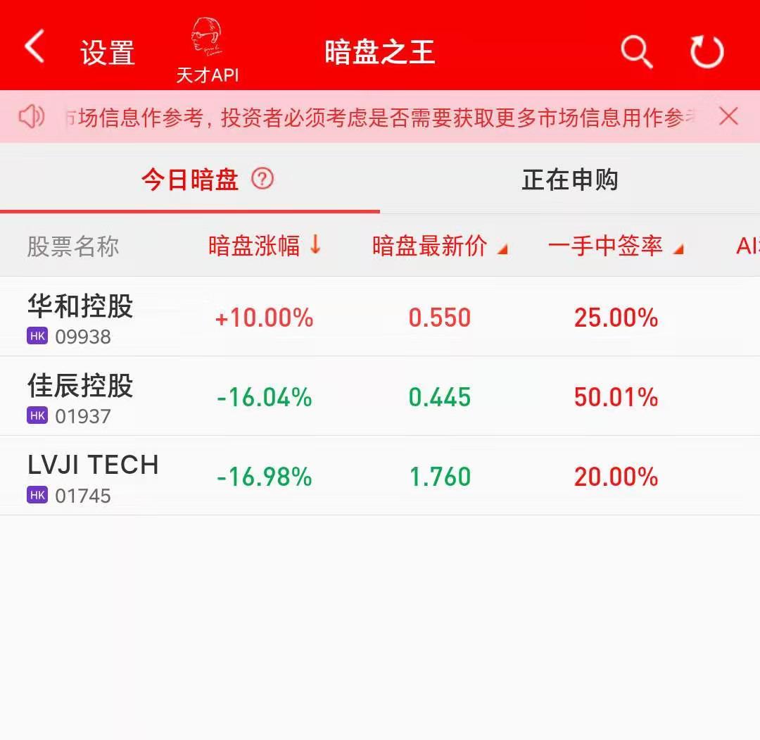 智通财经APP获悉,华和控股(09938)、佳辰控股(01937)、LVJI YECH(01745)将于1月17日挂牌,今日暗盘开盘涨跌不一,截止到发稿,利弗莫尔证券暗盘交易分别显示其涨10%、跌16.04%、跌16.98%。