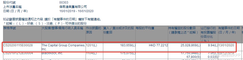 智通财经APP获悉,联交所最新资料显示,1月13日,The Capital Group减持伟易达(00303)18.37万股,每股作价77.2212港元,涉及总金额约为1418.55万港元。减持后最新持股数目约为2502.89万股,最新持股比例为9.94%。