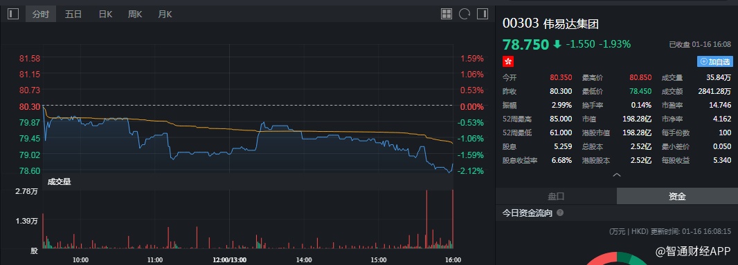 截至今日收盘,伟易达(00303)跌1.93%,报78.75港元。